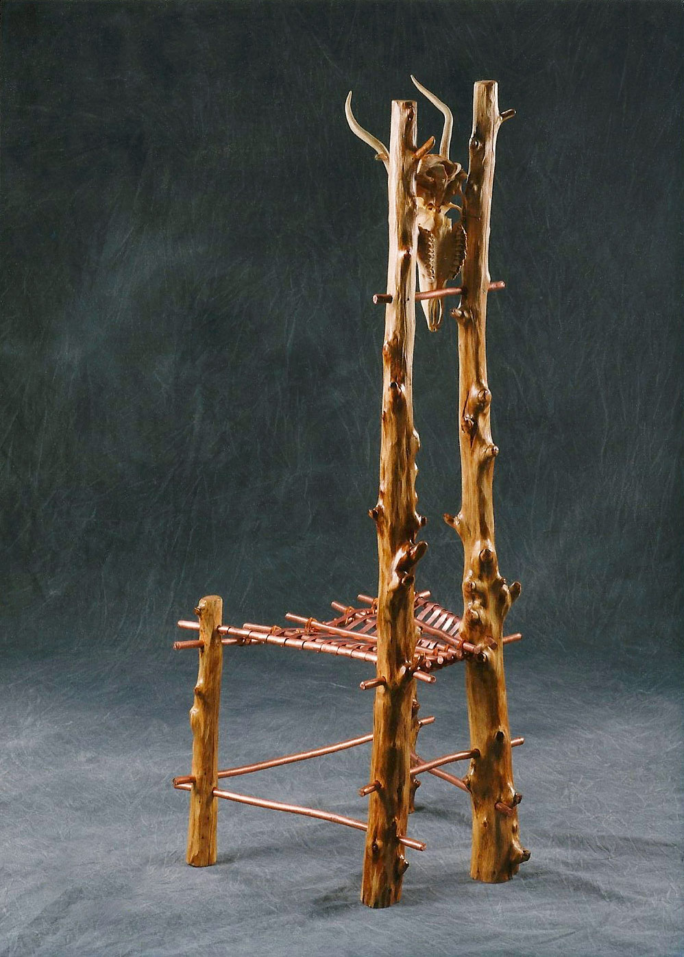 The weather dried, eastern cedar wood, in a high gloss finish, enhanced with ornamentation and copper spokes and weave, combine to create this rustic Eighteenth Century style high back chair. This rustic, but elegant chair is sure to be a conversation piece in any setting.